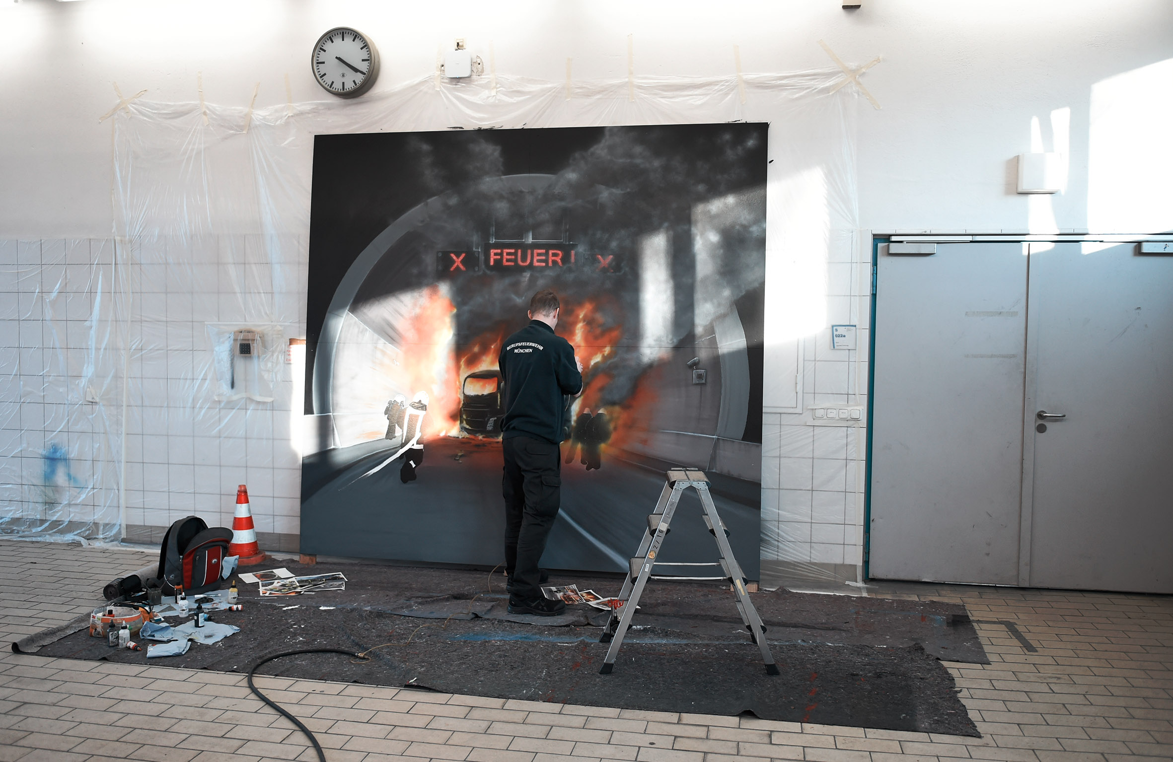 Er ist Feuerwehrmann auf der Wache 2 in München-Sendling. Roland Krabichler greift aber fast genaso oft zur farbgefüllten Pistole wie zu seinem Einsatzmantel. Krabichler ist Airbrush-Künstler und hat sich zum dritten Mal dazu bereit erklärt, den Stand der AGBF und der vfdb mit seinen Kunstwerken zu versehen. An der Wand einer Fahrzeughalle hat er eine von fünf großen roten Holzplatten aufgestellt. Um ihn herum stehen kleine Behälter mit Farben, liegen bunte Tücher und bedruckte Zettel herum. Vorsicht ist aufgrund der großen und kleinen Farbkleckse auf dem Boden geboten. Es sieht ein wenig chaotisch aus. Aber es ist Chaos mit System. Krabichler mischt hier akribisch Farben zurecht, um den richtigen Ton zu treffen. Er probiert aus, mischt weiter und widmet sich dann wieder zufrieden dem Bild auf der roten Holzwand.